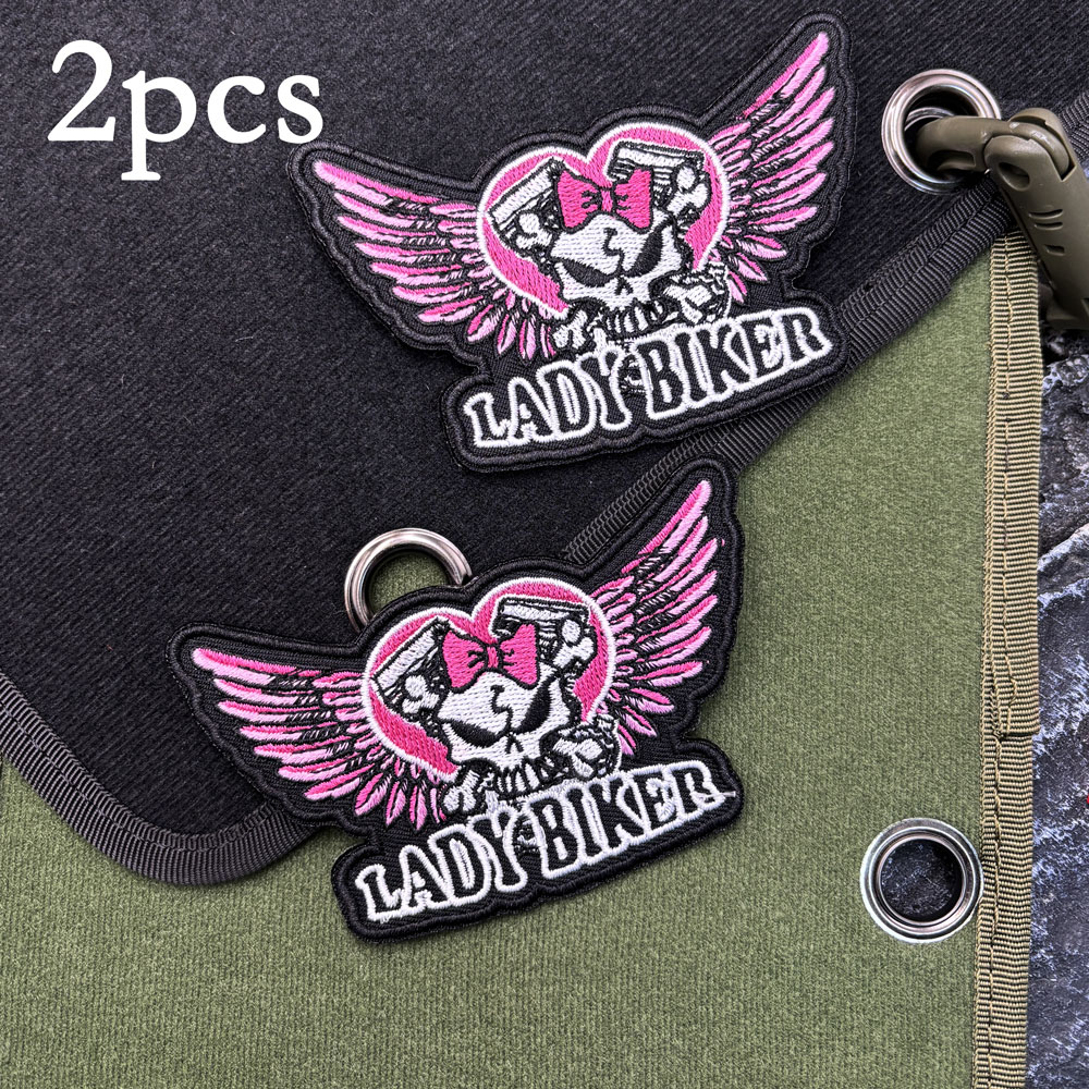 2PCS LADY BIKER Skull Pink Bow Wings Embroidery Patch CA34-1