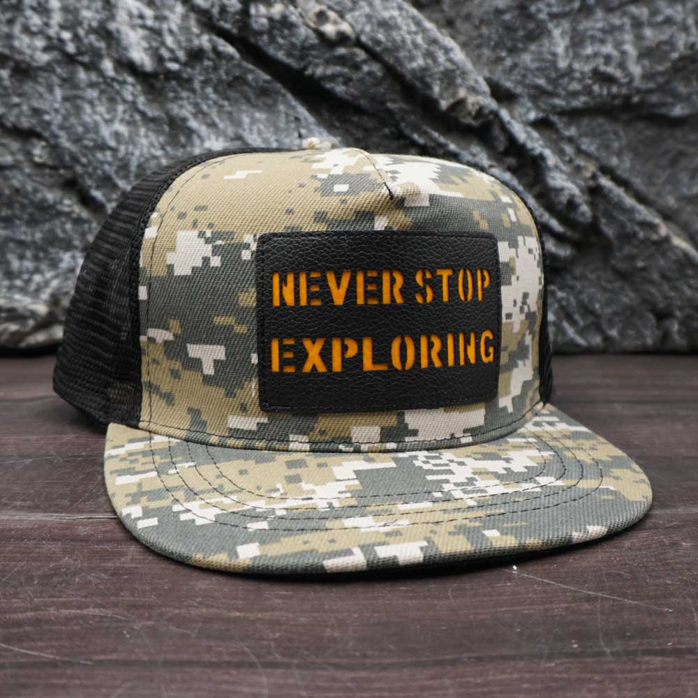 Classic "NEVER STOP EXPLORING" Outdoor Adventure Reflective Leather Patch Trucker Cap PC7-2/A5