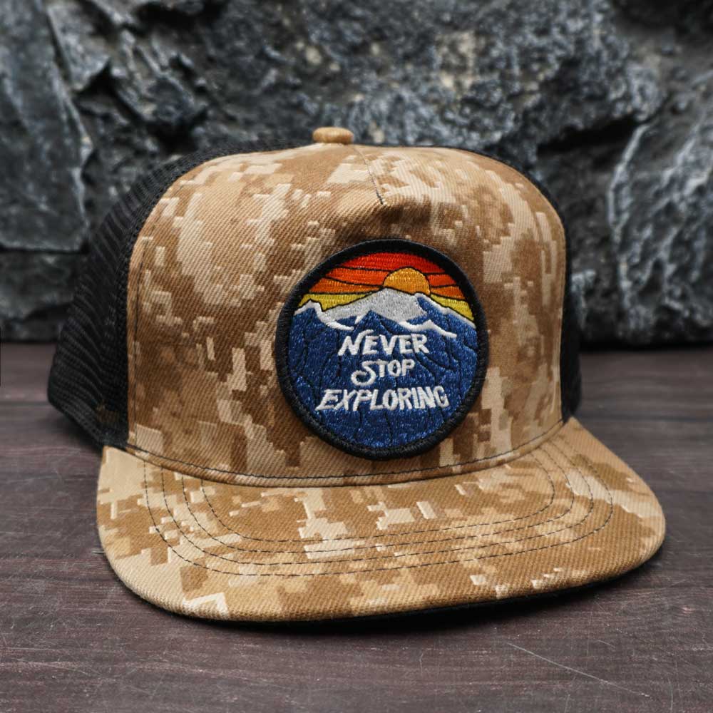 Classic “NEVER STOP EXPLORING” Outdoor Hiking Adventure Embroidery Patch Trucker Hat PC75-1