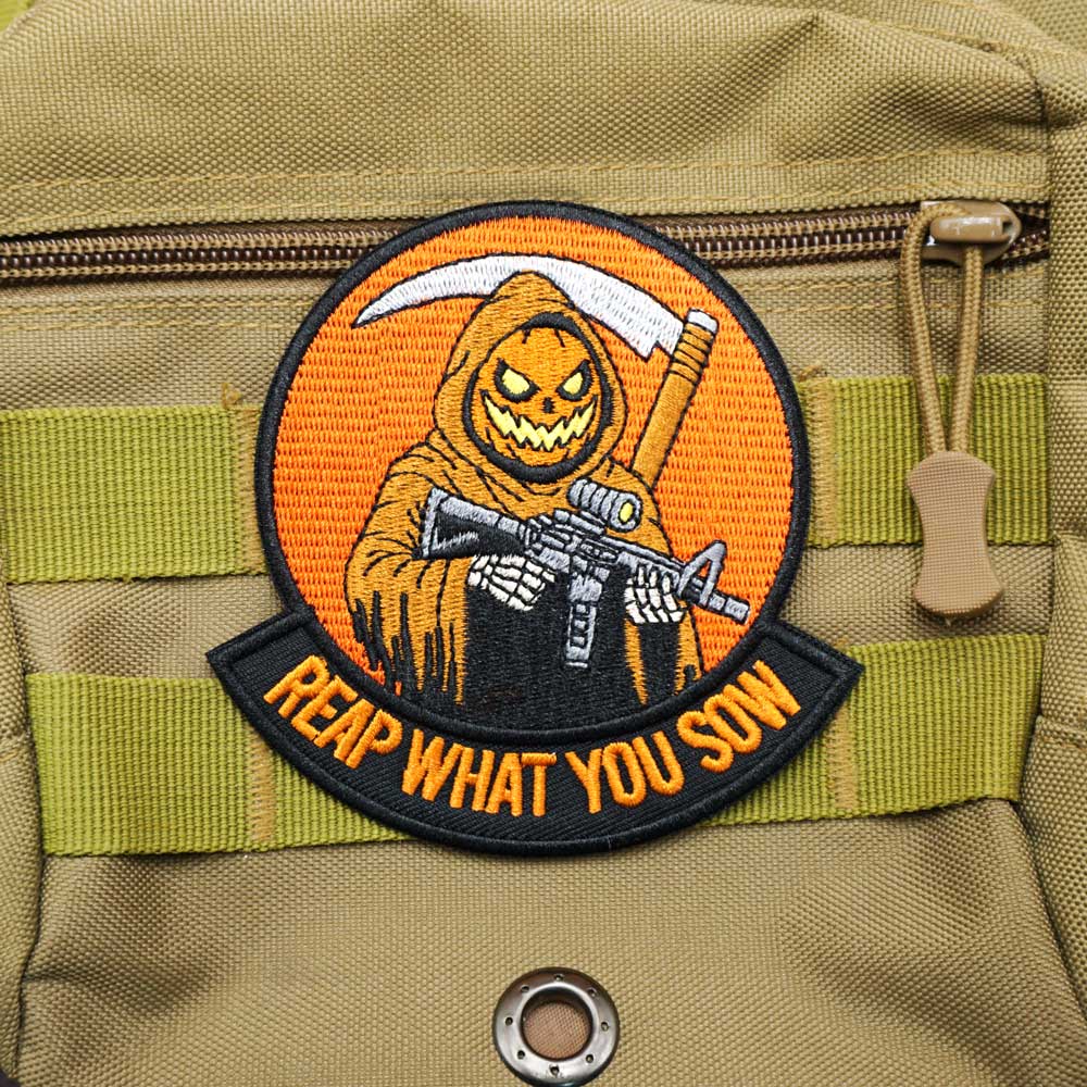 Halloween Grim Reaper Pumpkin Skull Embroidery Patch REAP WHAT YOU SOW Flag12-242C