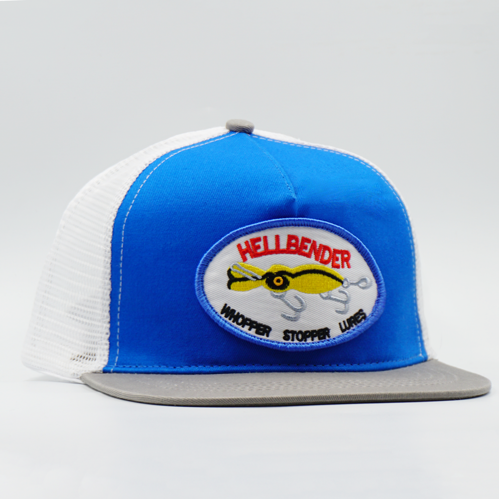 Vintage “HELLBENDER WHOPPER STOPPER LURES” Embroidery Patch Trucker Cap A12/PB73-1